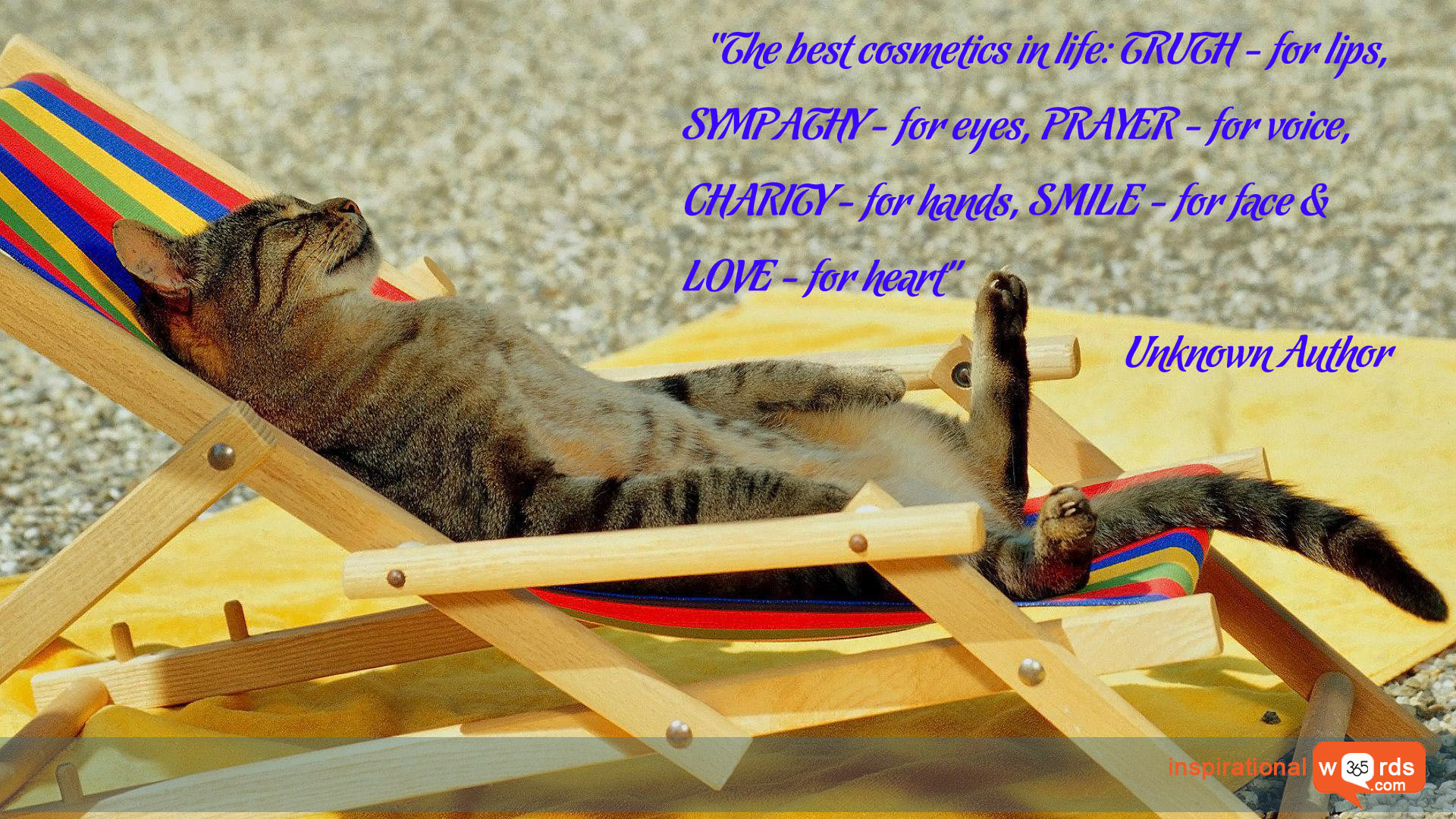 “The best cosmetics in life: TRUTH – for lips, SYMPATHY – for eyes, PRAYER – for voice, CHARITY – for hands, SMILE – for face & LOVE – for heart.”