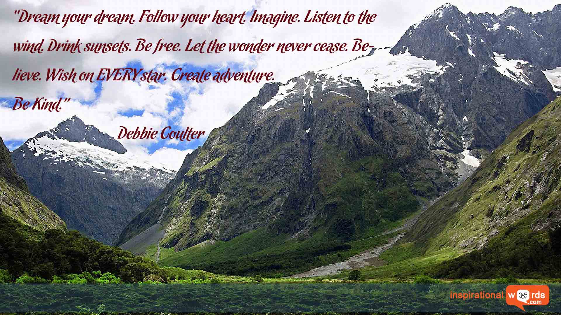 “Dream your dream. Follow your heart. Imagine. Listen to the wind. Drink sunsets. Be free. Let the wonder never cease. Believe. Wish on EVERY star. Create adventure. Be Kind.”