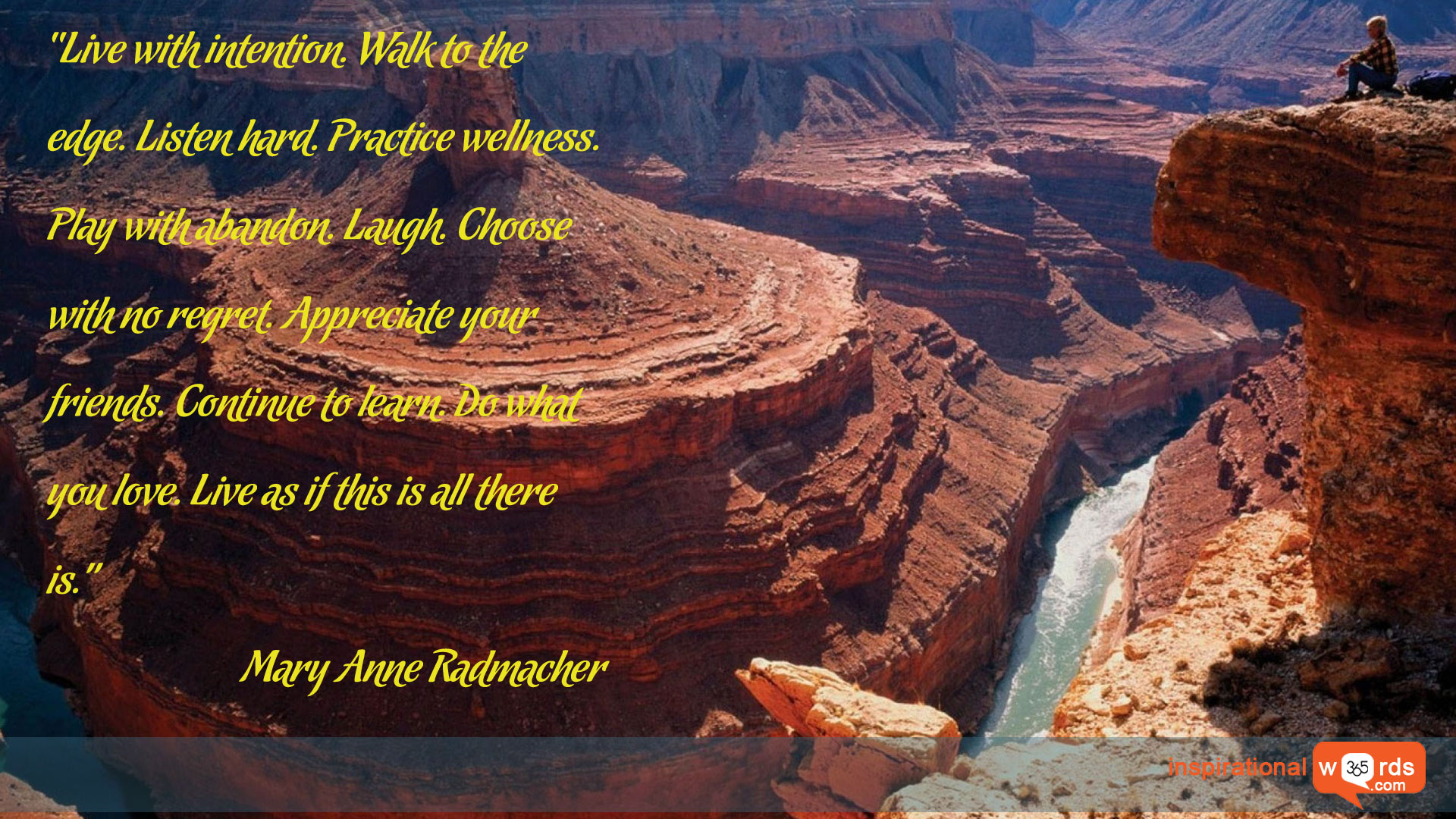 “Live with intention. Walk to the edge. Listen hard. Practice wellness. Play with abandon. Laugh. Choose with no regret. Appreciate your friends. Continue to learn. Do what you love. Live as if this is all there is.”