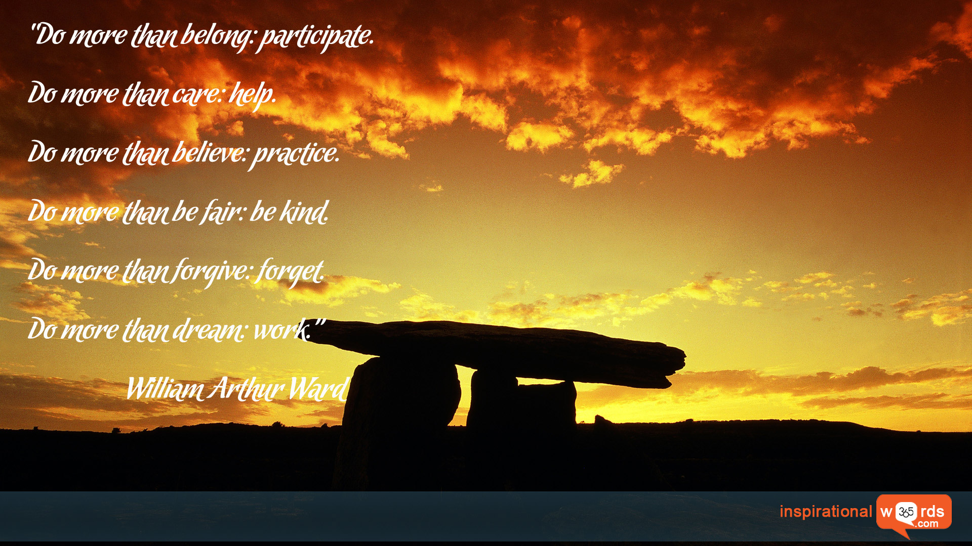“Do more than belong: participate. Do more than care: help. Do more than believe: practice. Do more than be fair: be kind. Do more than forgive: forget. Do more than dream: work.”